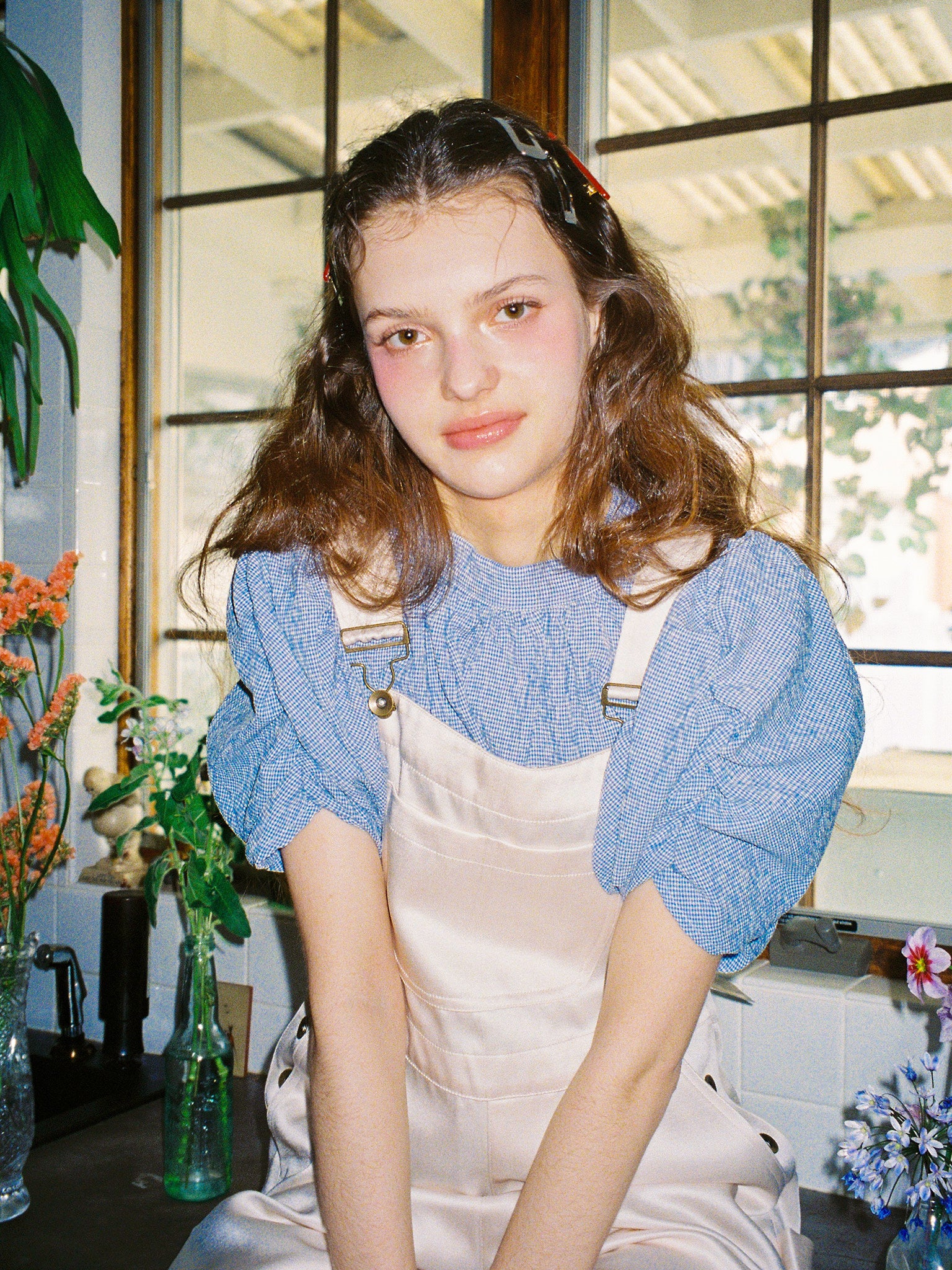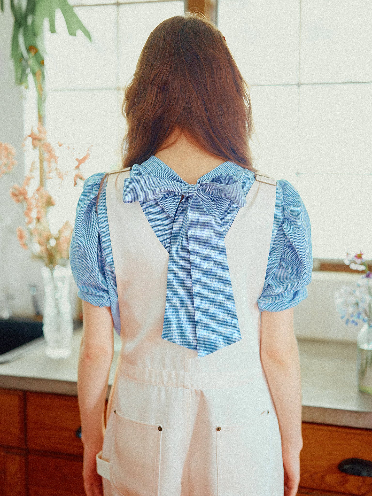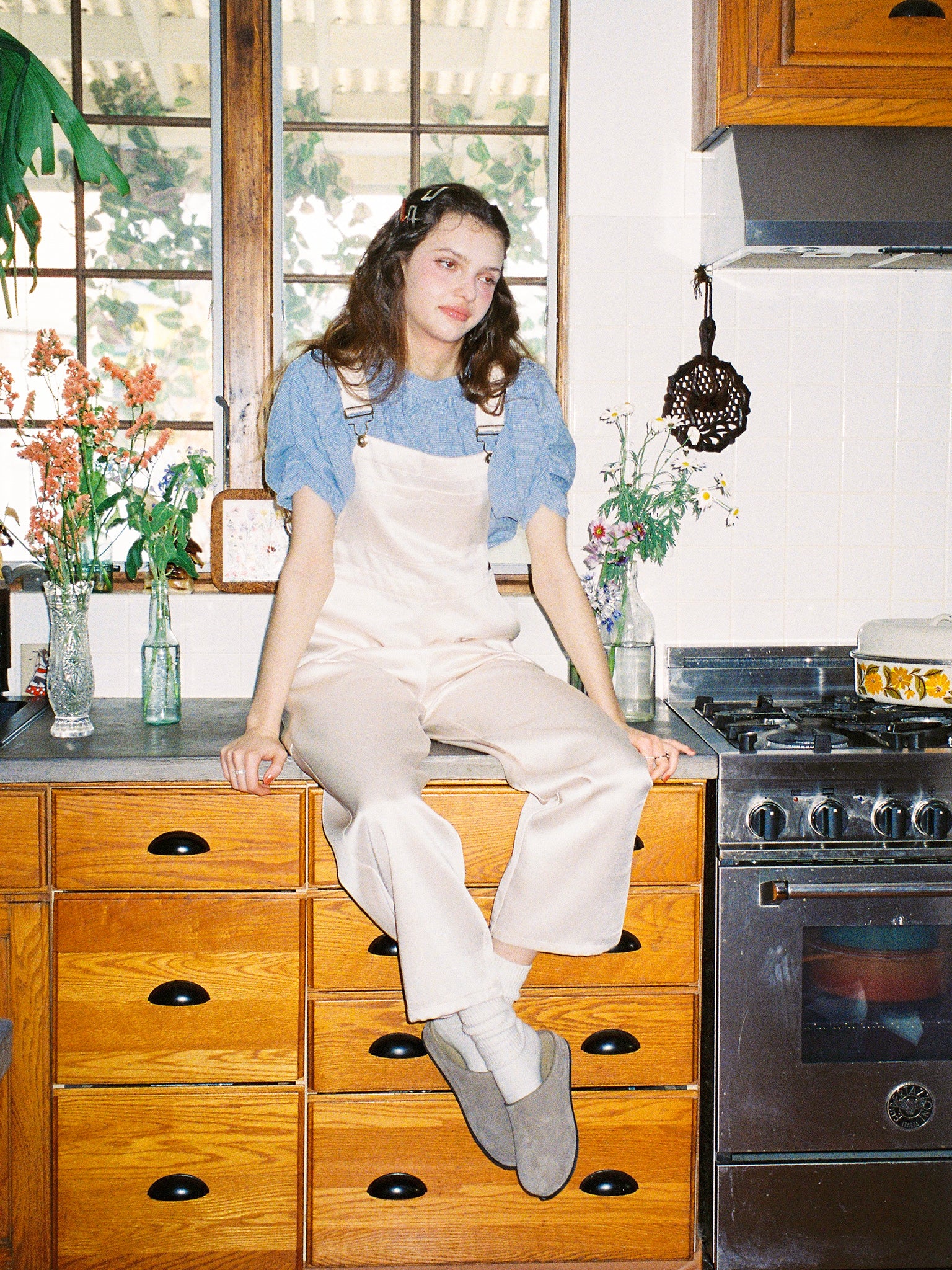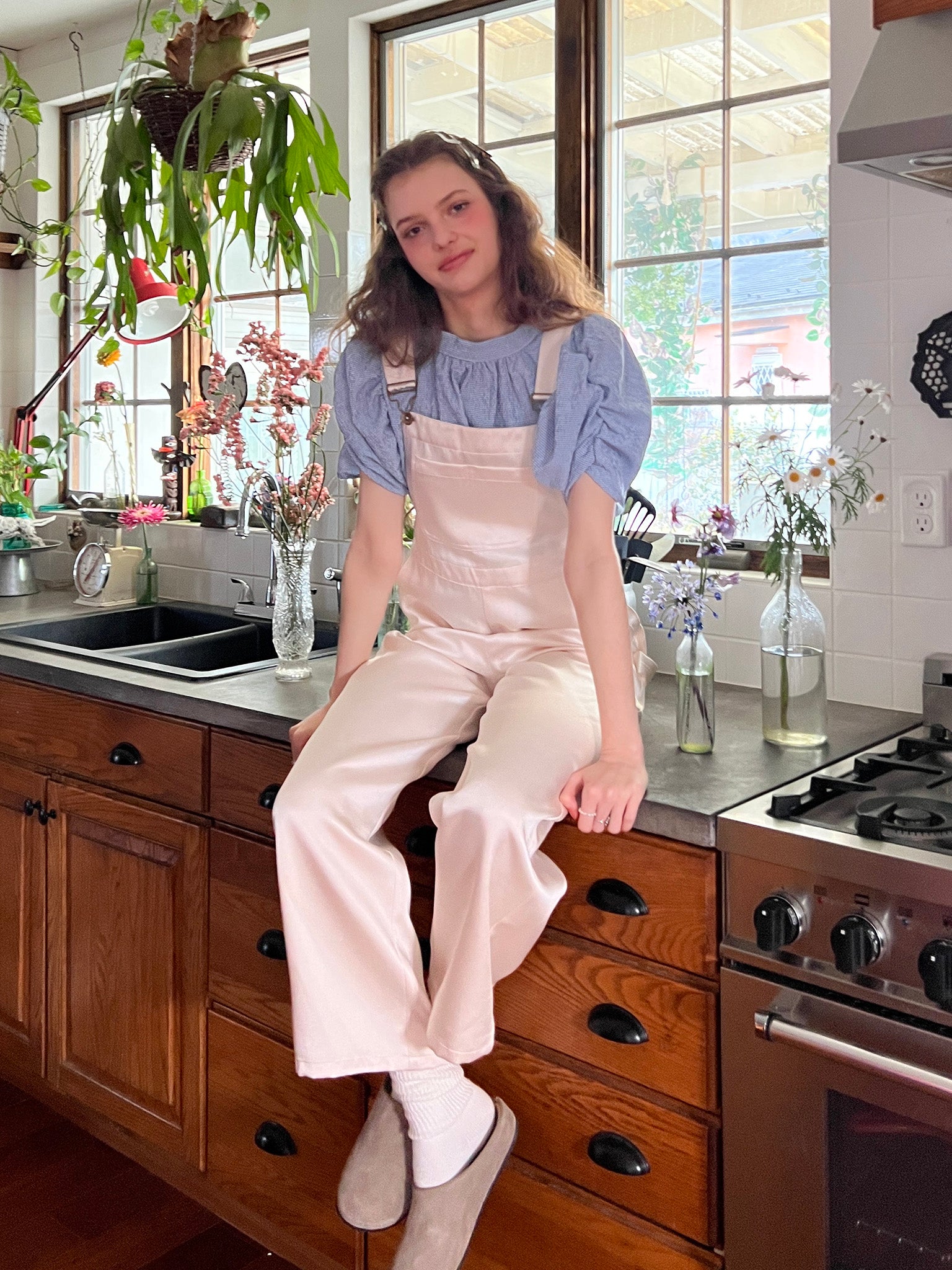 光沢のあるサテン生地を使ったサロペット。