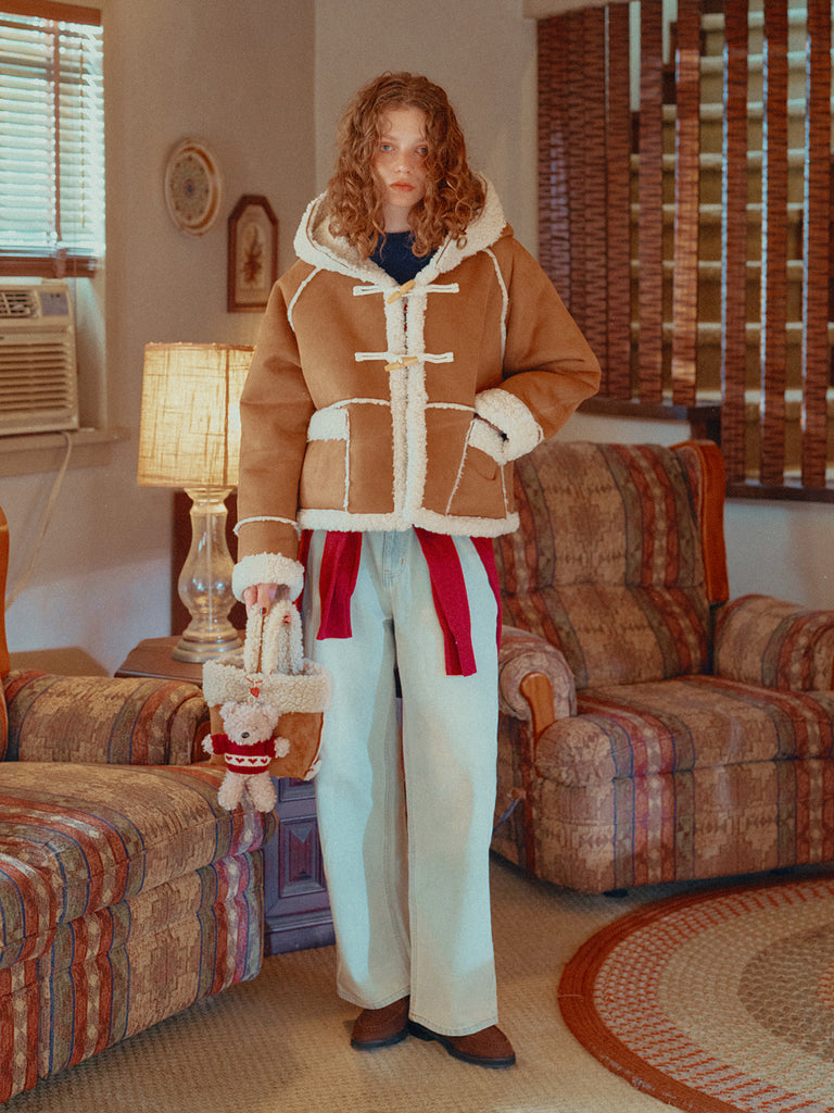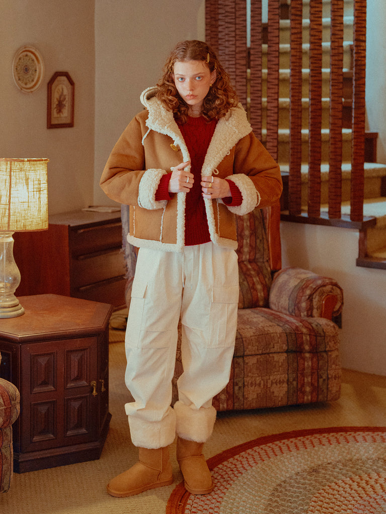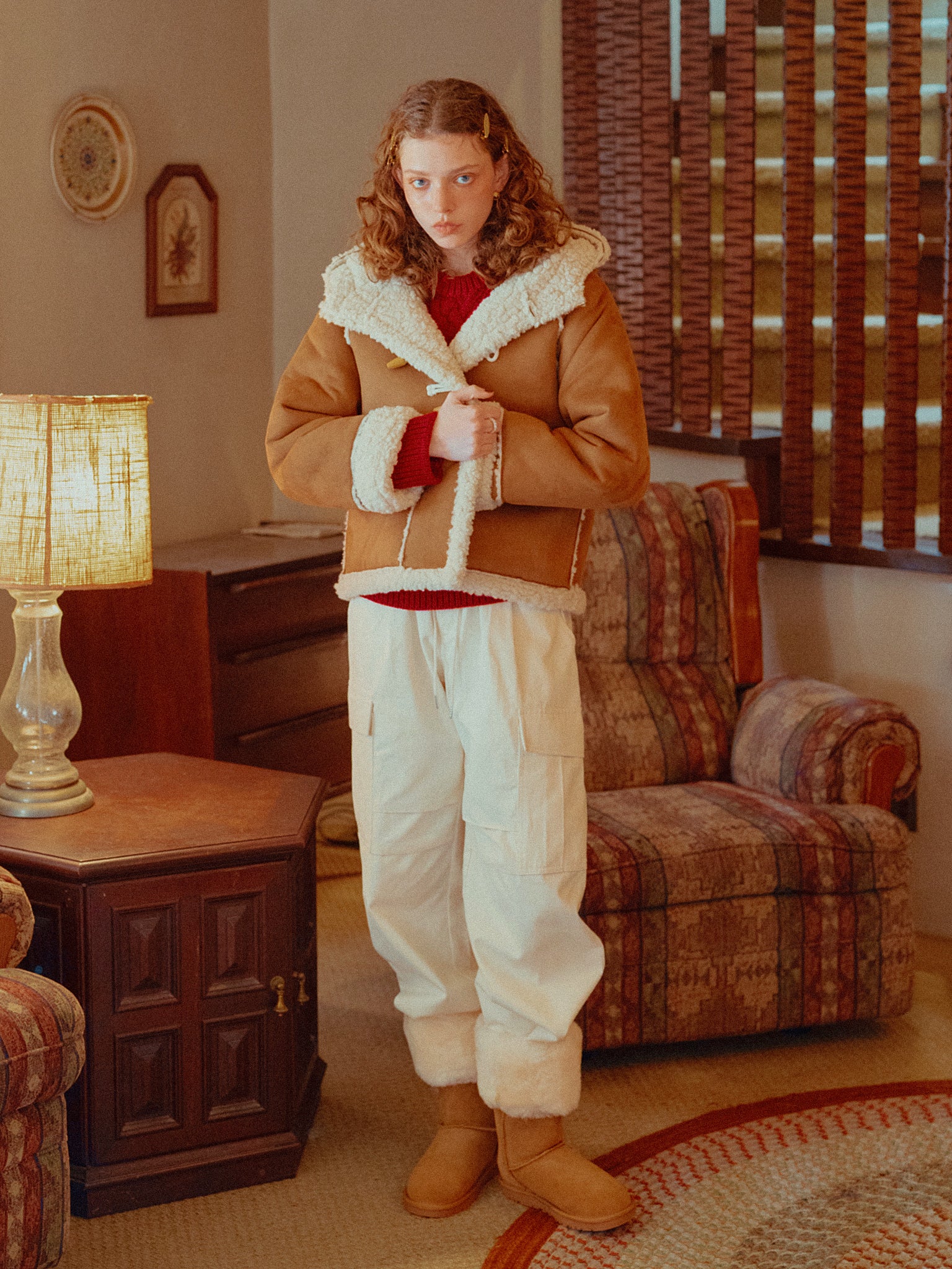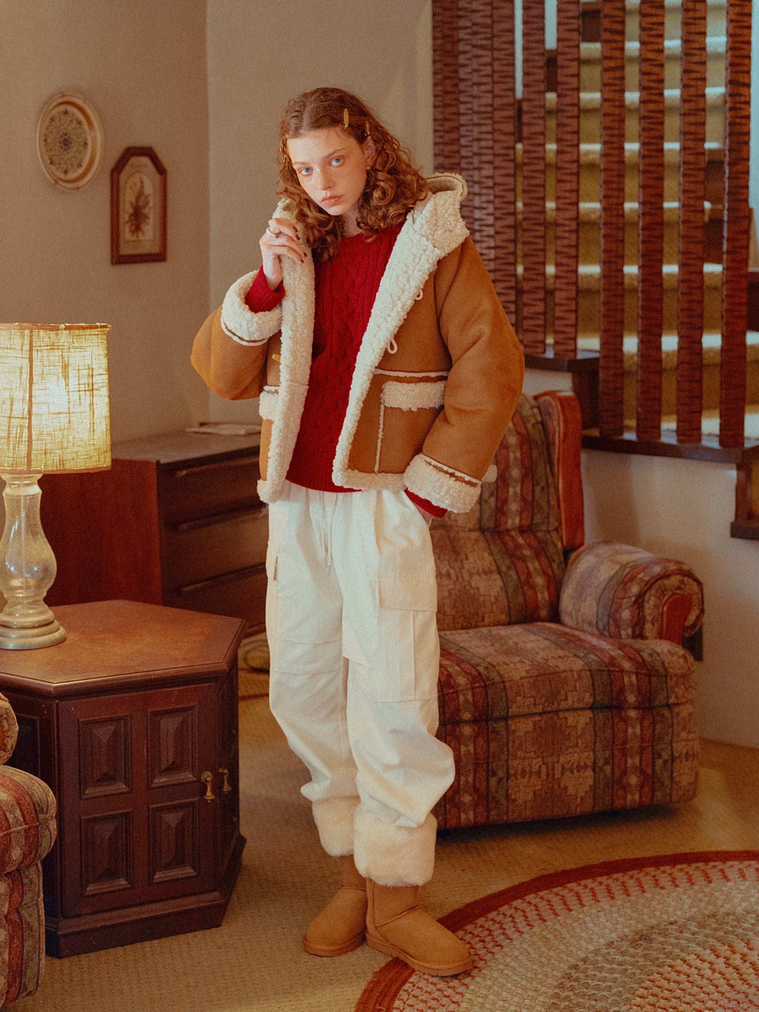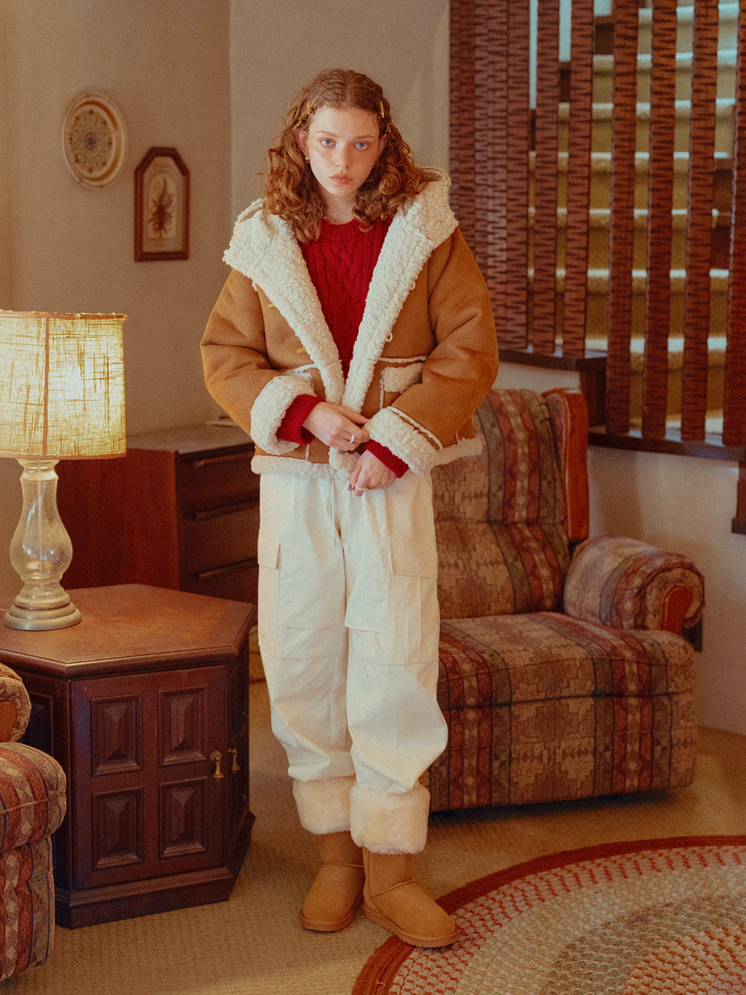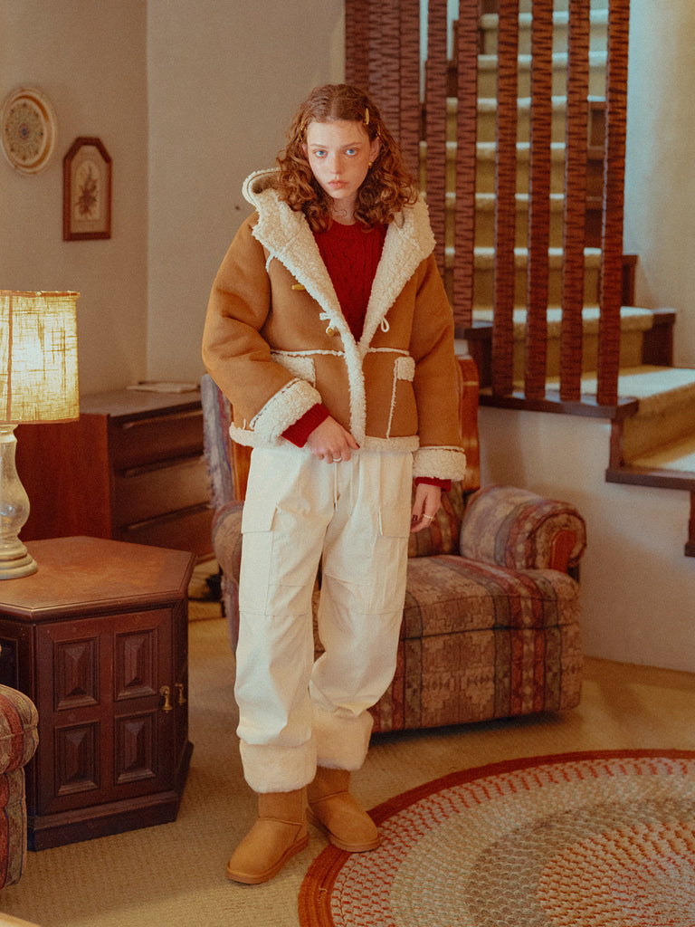 袖など折り返して見せたボアがガーリーさのあるデザイン。