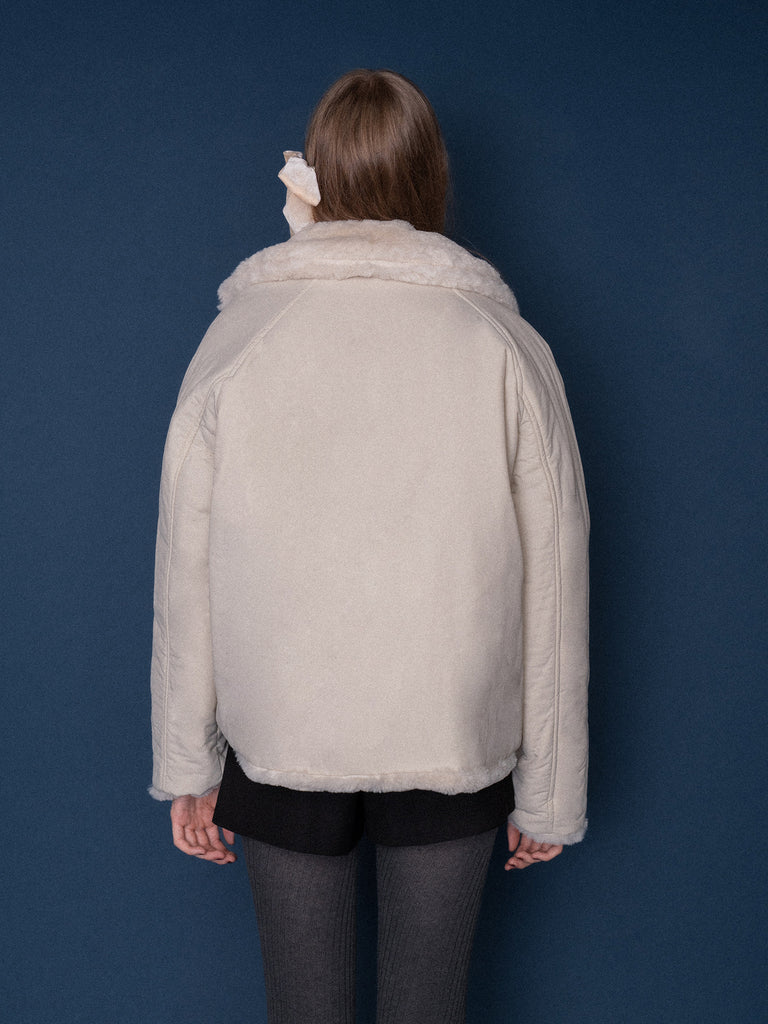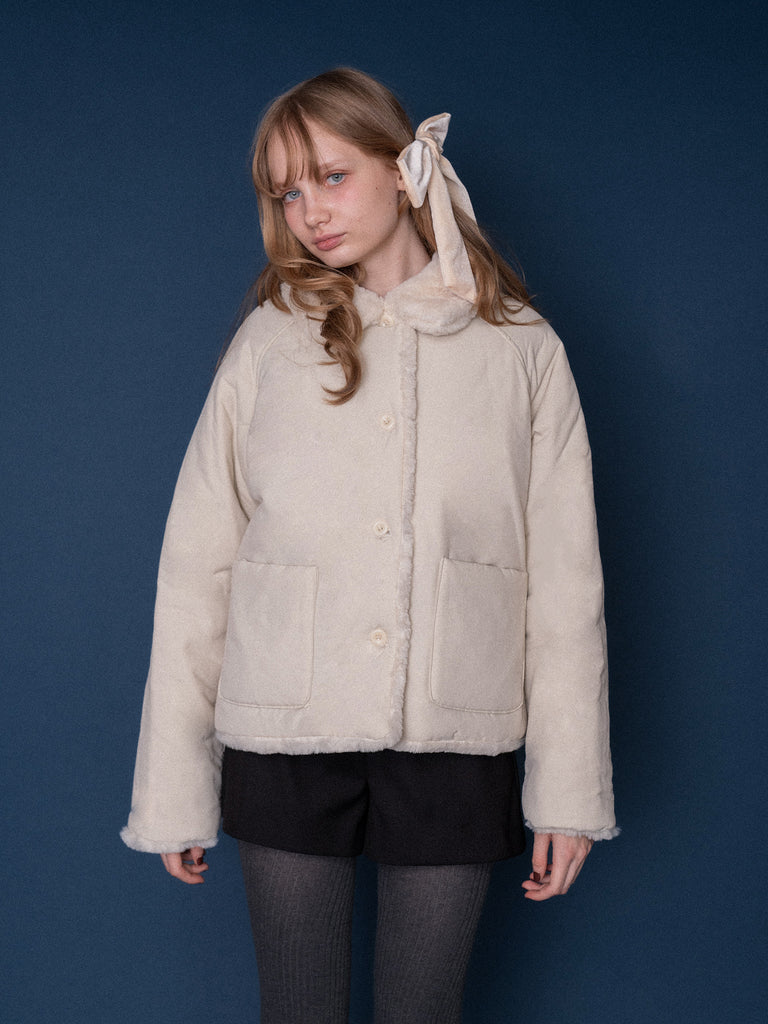 ナイロン生地を表にすると襟元にファーが見えてポイントに。